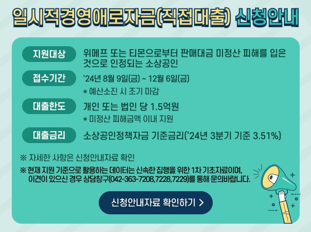 지원대상 : 위메프 또는 티몬으로부터 판매대금 미정산 피해를 입은 것으로 인정되는 소상공인 또는 중소기업